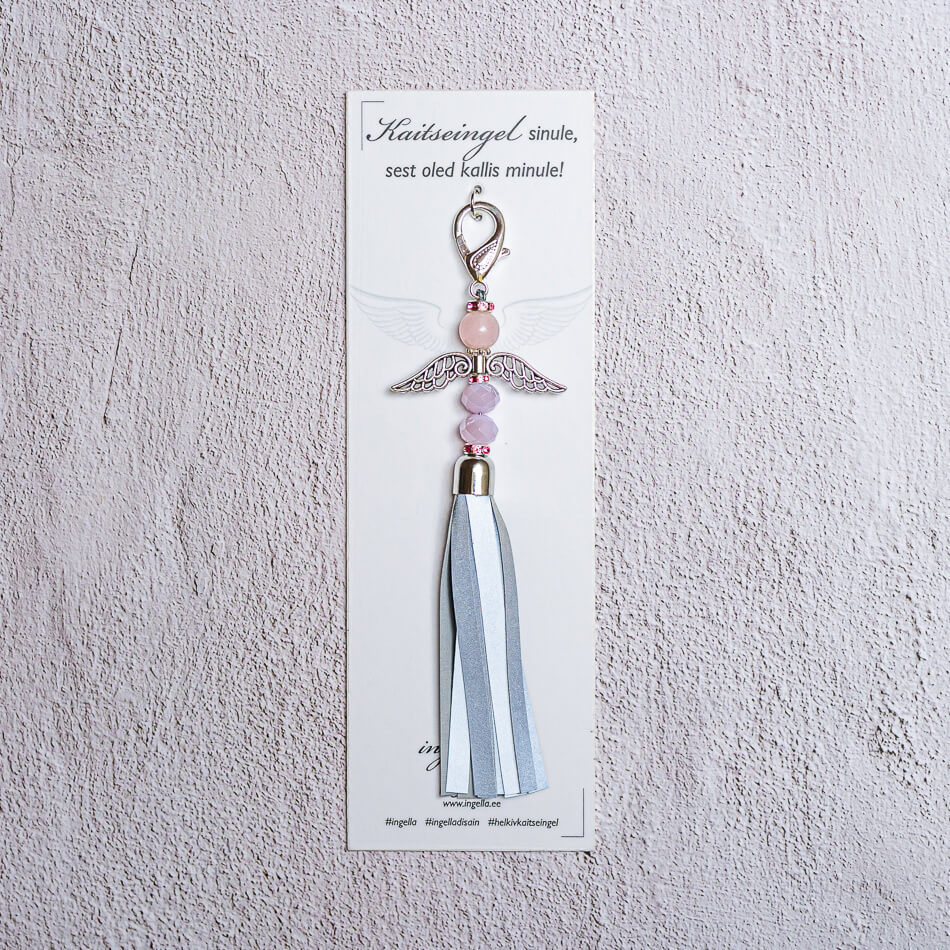 Käsitööna valminud helkiv kaitseingel, poolvääriskividest on kasutatud roosat kvartsi.
