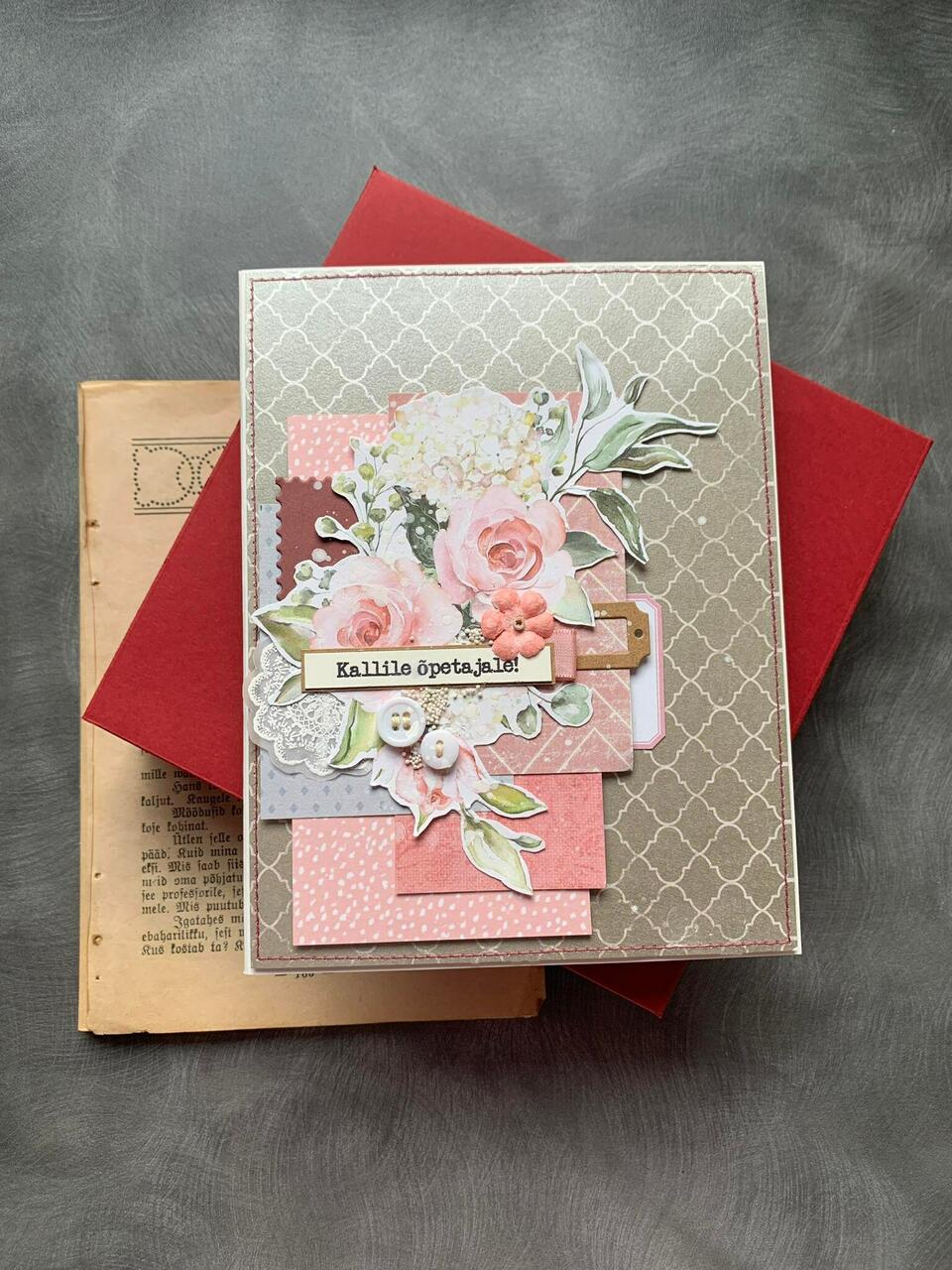 Kaunis käsitöökaart õpetajale tänusõnade ja heade soovide edastamiseks. Kaardi sees on luuletus ja tagaküljel kiri "Aitäh".
