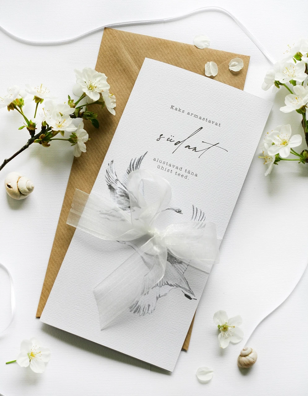 Imekaunis pulmakaart luikedega, loodud Plärts poolt. Pulmakaardi kaane peal on südamlik sõnum ning sees on rahatasku. Kõik illustratsioonid on originaallooming.