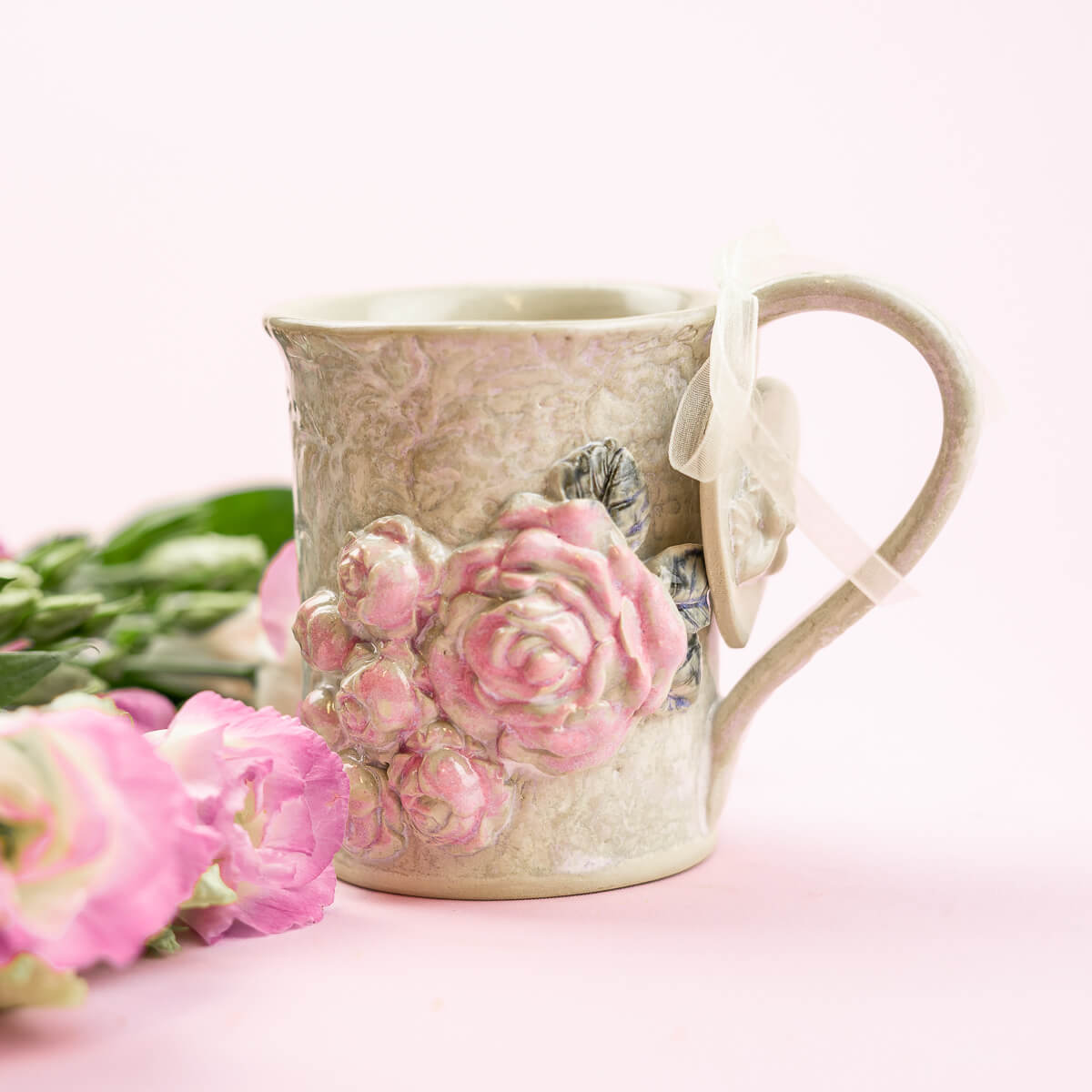 Õrn ja romantiline kruus, valminud Eestis käsitööna Liivika Asumaa poolt. Tarbekeraamika sarjast "Roos".