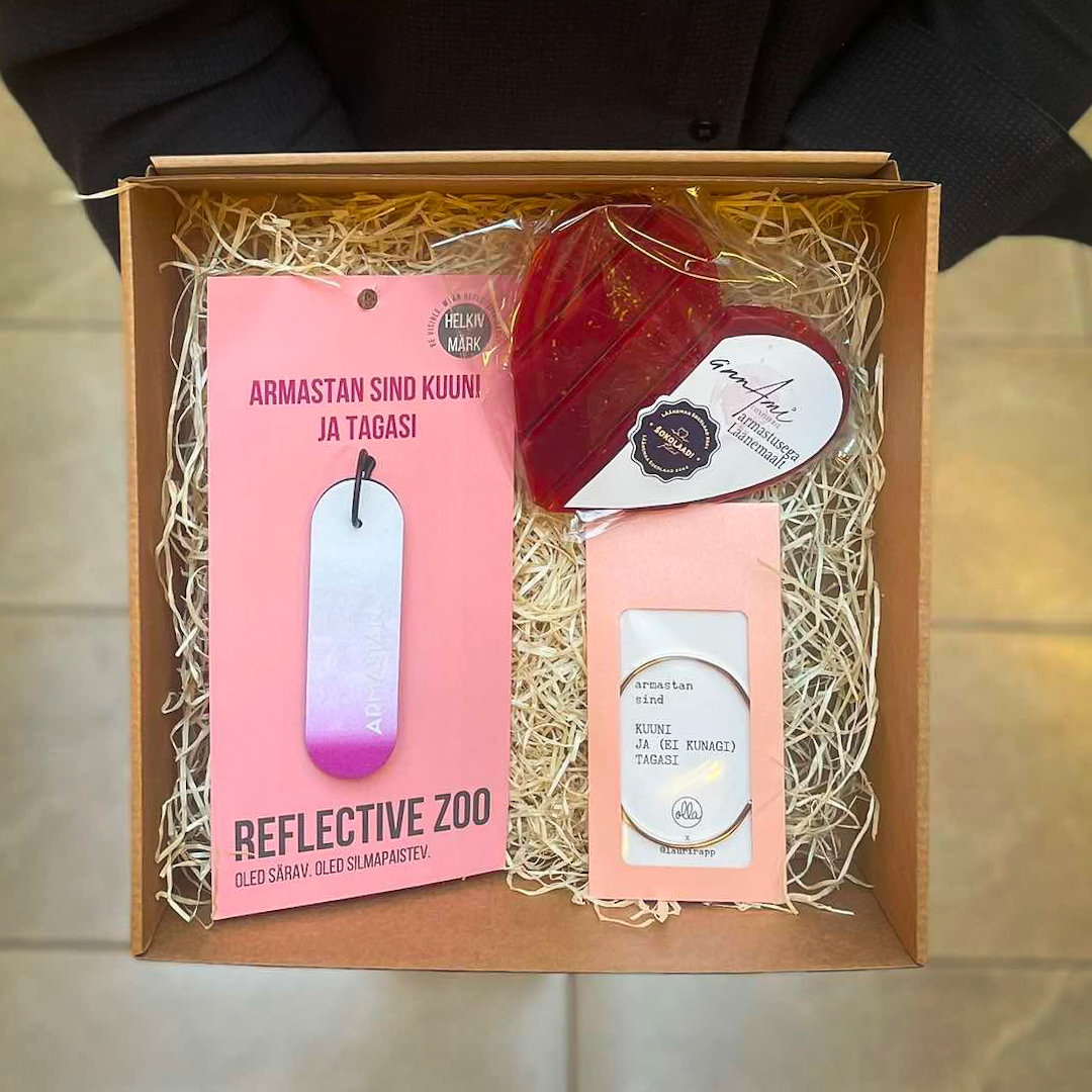 Kinkekomplekt sisaldab Reflective Zoo helkurit "Armastan Sind kuuni ja tagasi", AnnAmi šokolaadi Armastusega Läänemaalt ja Olla käeehet "Armastan sind kuuni ja (ei kunagi) tagasi.