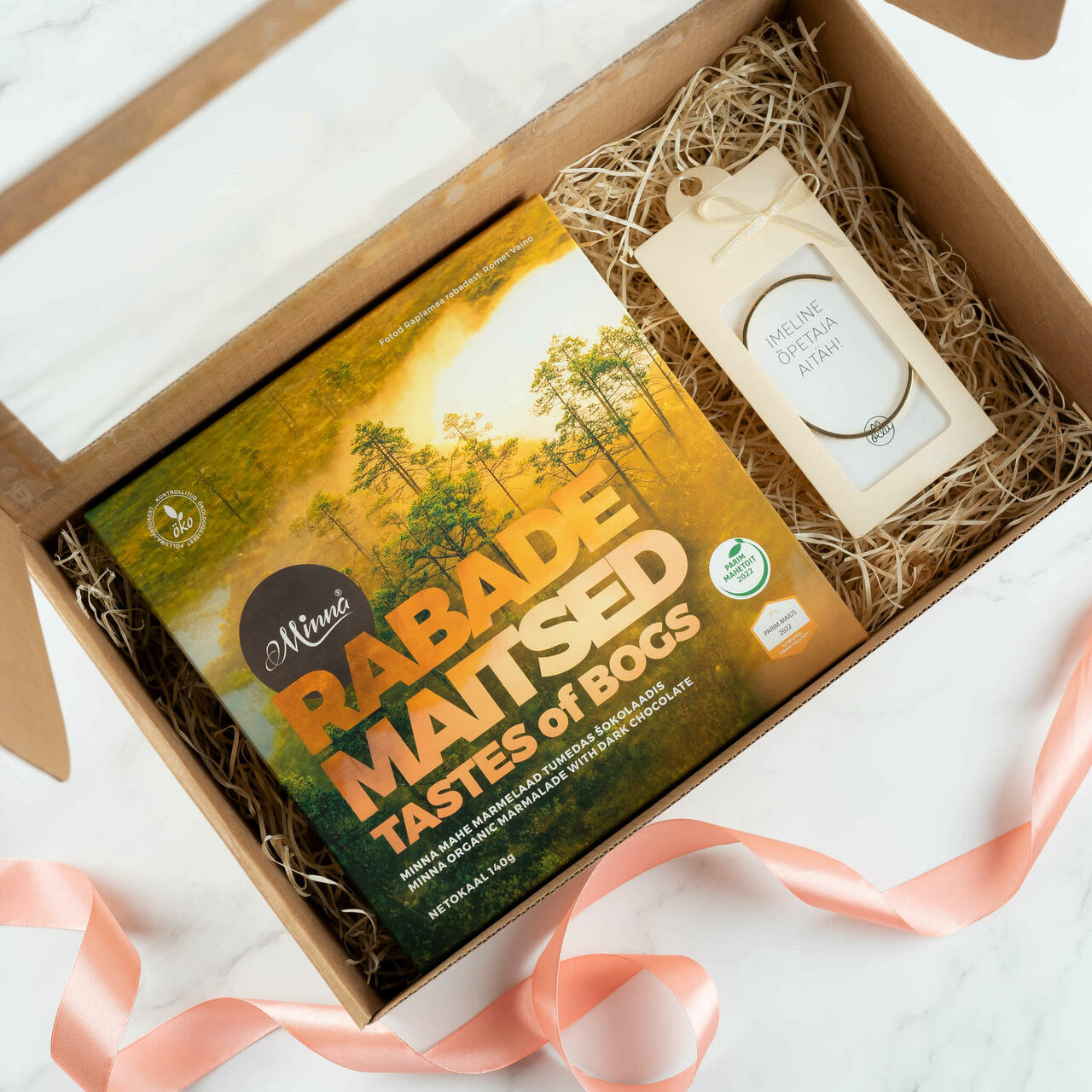 Kinkekomplekt sisaldab kommikarpi Minna mahe marmelaadid tumedas šokolaadis ja Olla sõnumiga käeehet. Käeehet on 3 värvitooni: kuld, roosa kuld, hõbe. Märgi käeehte sõnumi ja värvitooni soov tellimuse info lahtrisse ostukorvi vaates.