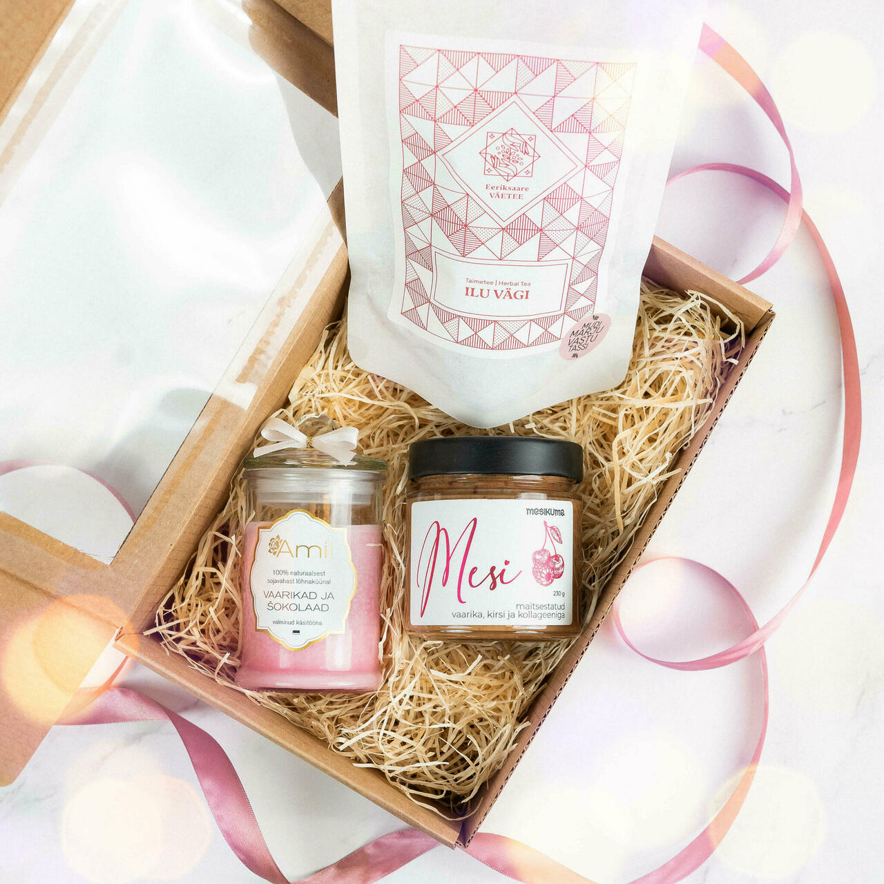 Kinkekomplekt sisaldab Eeriksaare Väeteed, Amii lõhnaküünalt ja Mesikuma maitsemett. Mõnus tee ja küünlavalgus on täiuslik kombo.