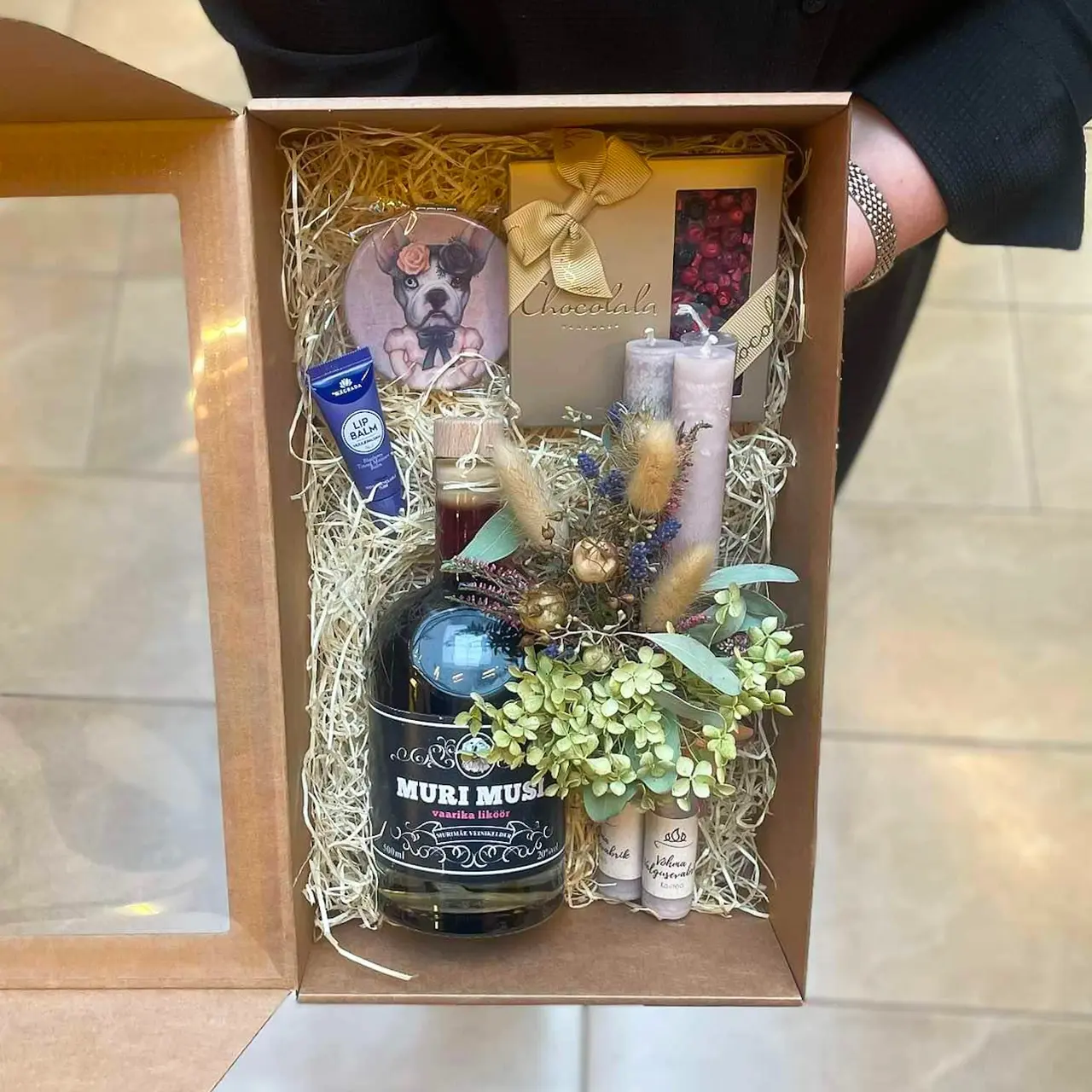 Kinkekomplekt sisaldab Vaarika likööri Muri Musi, Chocolala šokolaadi, Lucky Laika taskupeeglit, Magrada huulepalsamit või huulesalvi (Irja Salvid), küünlaid ja kuivlilledest kimbukest.