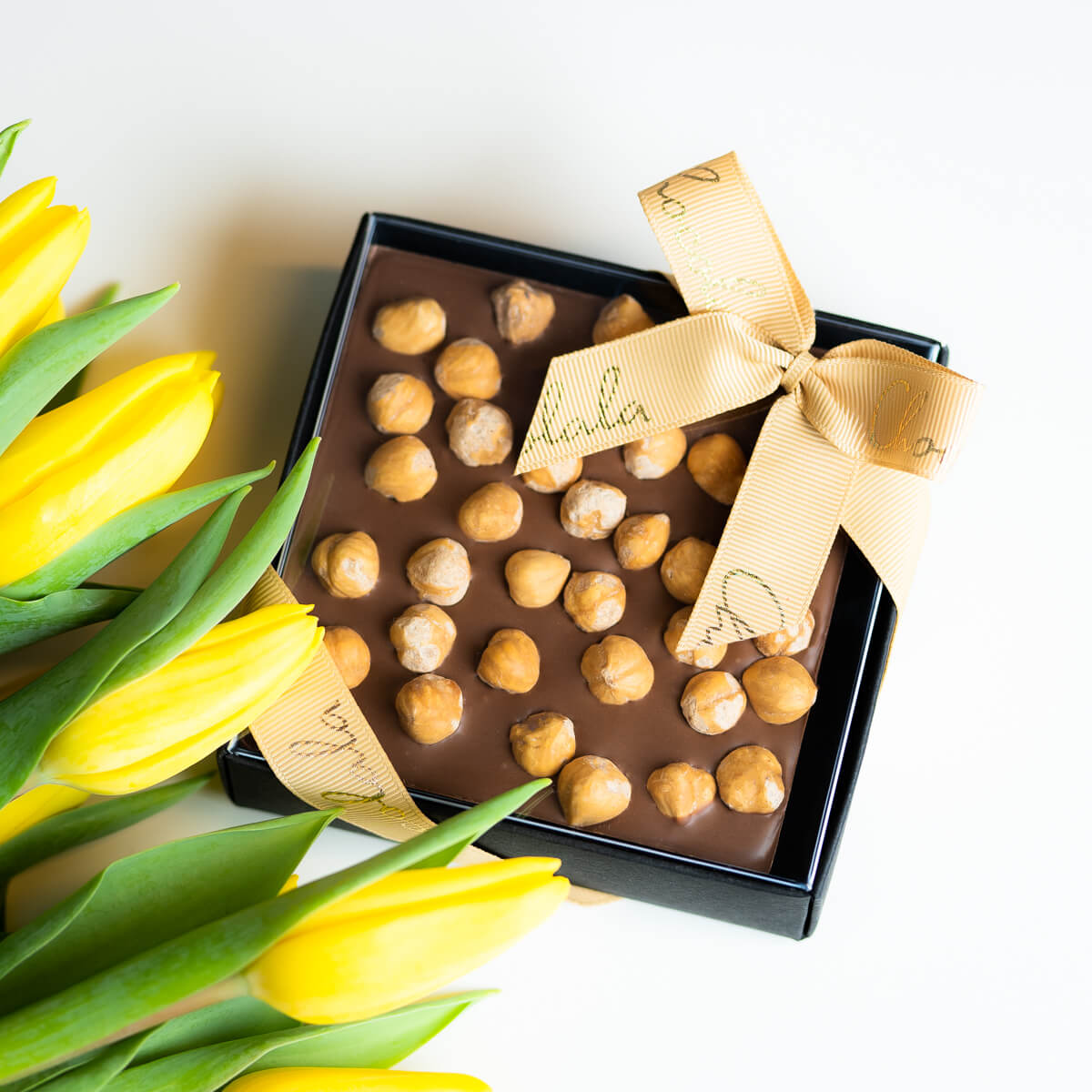 Piimašokolaad sarapuupähklitega, valminud käsitööna Eestis.