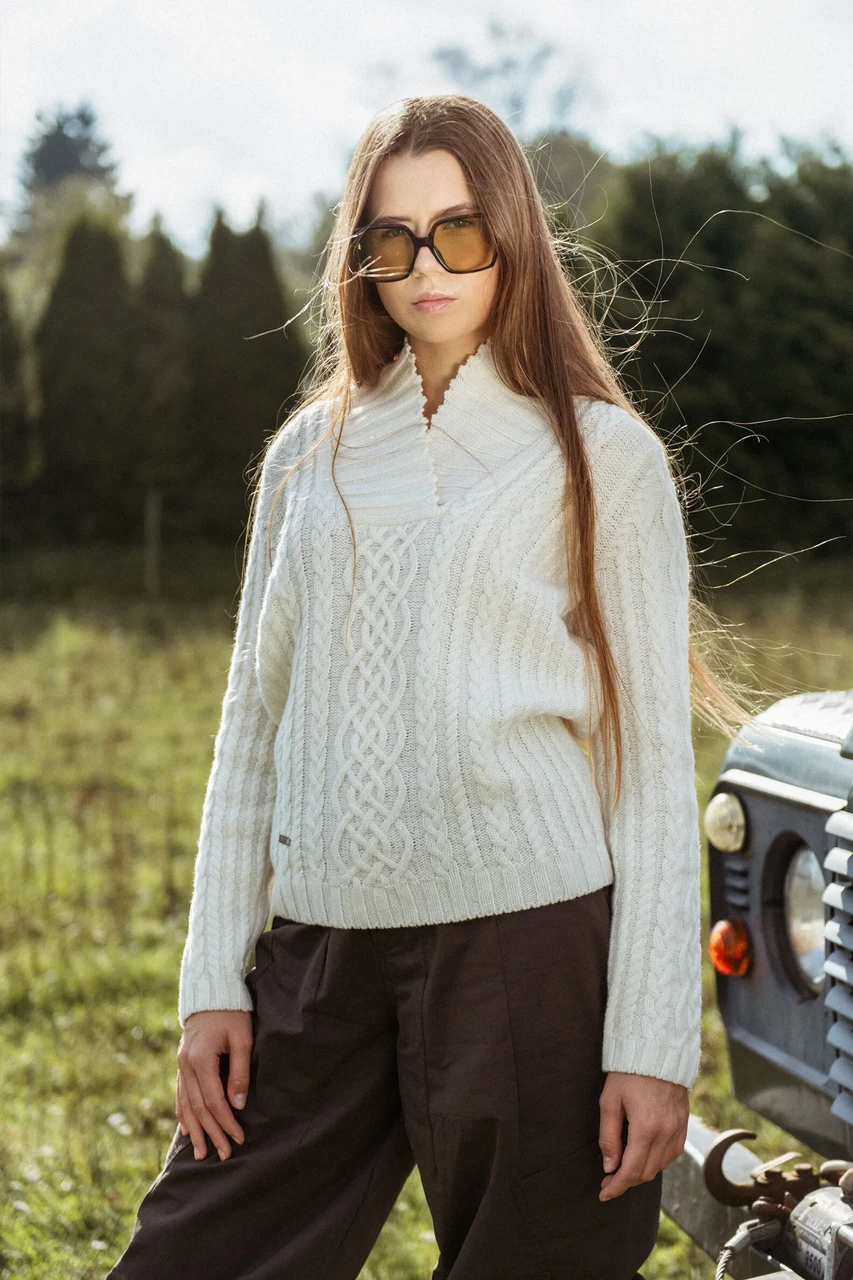 Keskmise paksusega sallkraega kampsun on soe ja väga pehme. Sallkrae servas on kaunistav pitsiline koerida. Kampsun on kootud üleni erinevate palmikute mustrilisena, ka seljaosa.