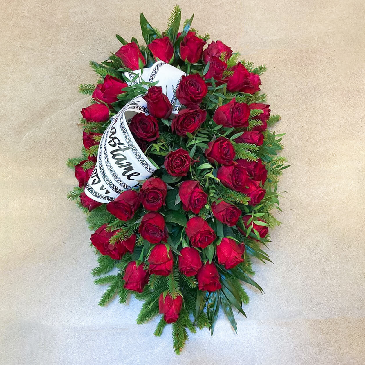 Roosidest leinakimp on valmistatud kuuseokstele ja spetsiaalsele vahtplast alusele (oasisele), tänu millele on kimp suurem ja püsib kauem haual vastu. Palume märkida roosi õite värvitooni eelistus ja muud erisoovid tellimuse info lahtrisse ostukorvi vaates.