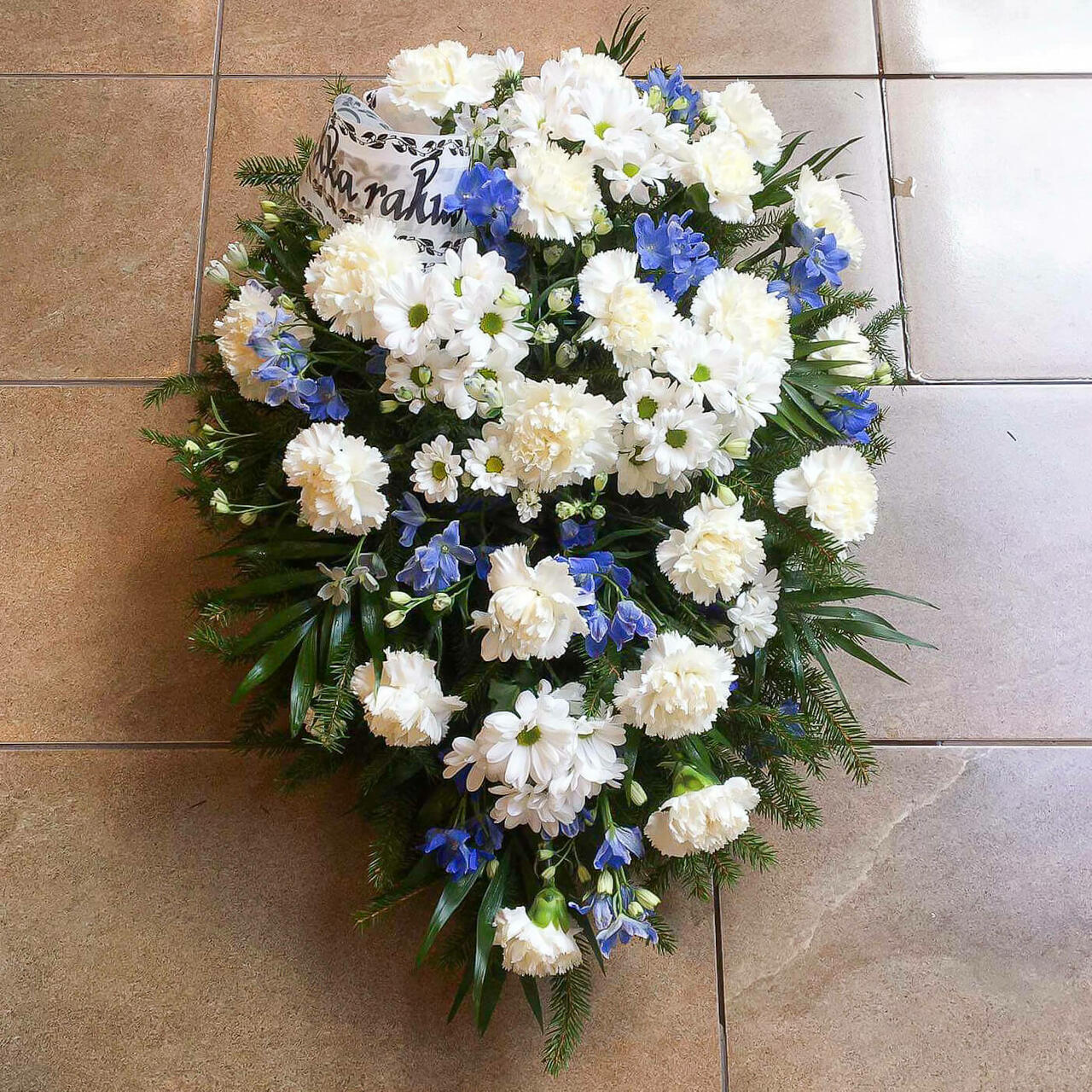 Valges ja sinises värvitoonis tilgakujuline leinakimp on valmistatud kuuseokstele ja spetsiaalsele vahtplast alusele (oasisele), tänu millele on kimp suurem ja püsib kauem haual vastu.