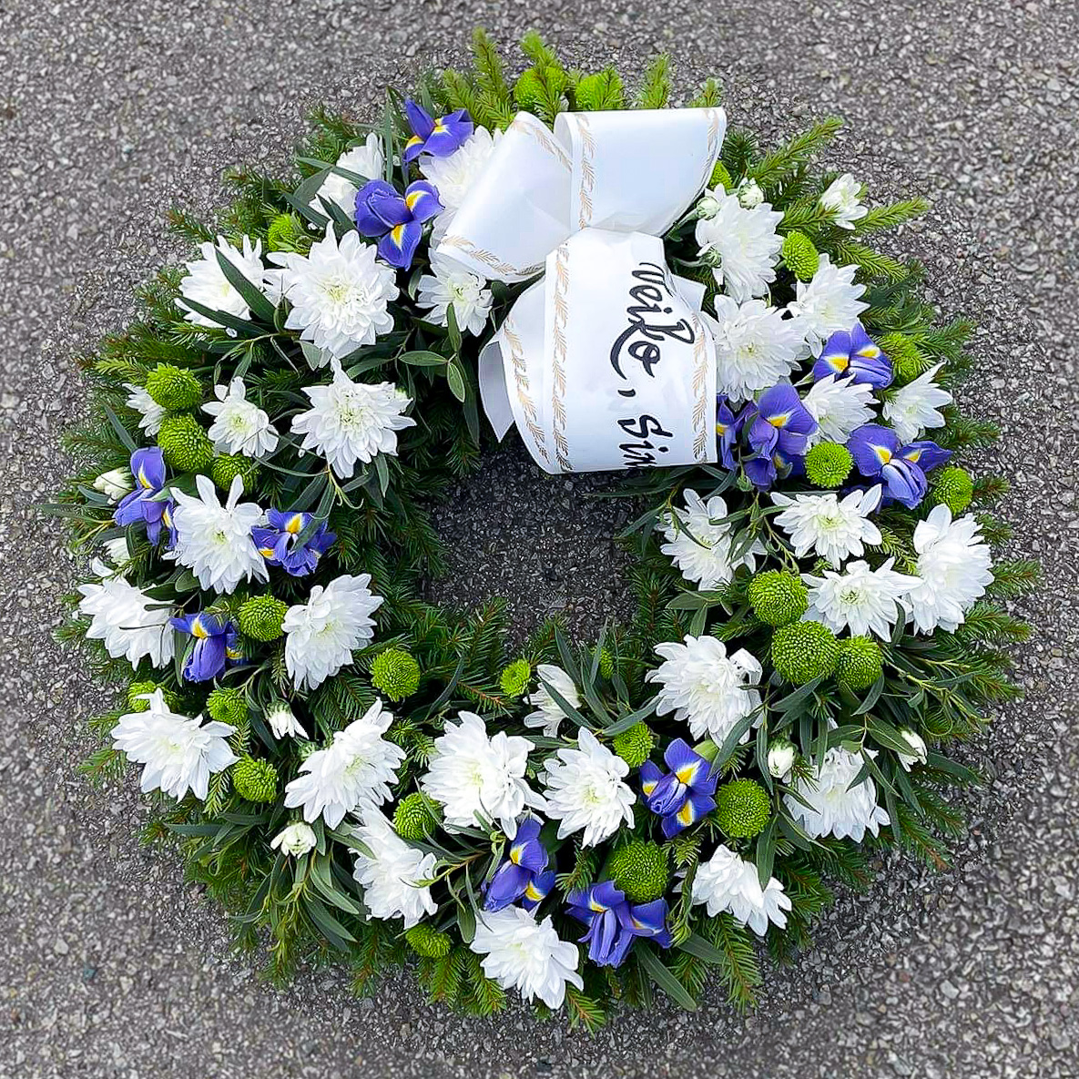 Valge-sinine täislilledest leinapärg valmistatakse spetsiaalsele vahtplast alusele (oasisele).