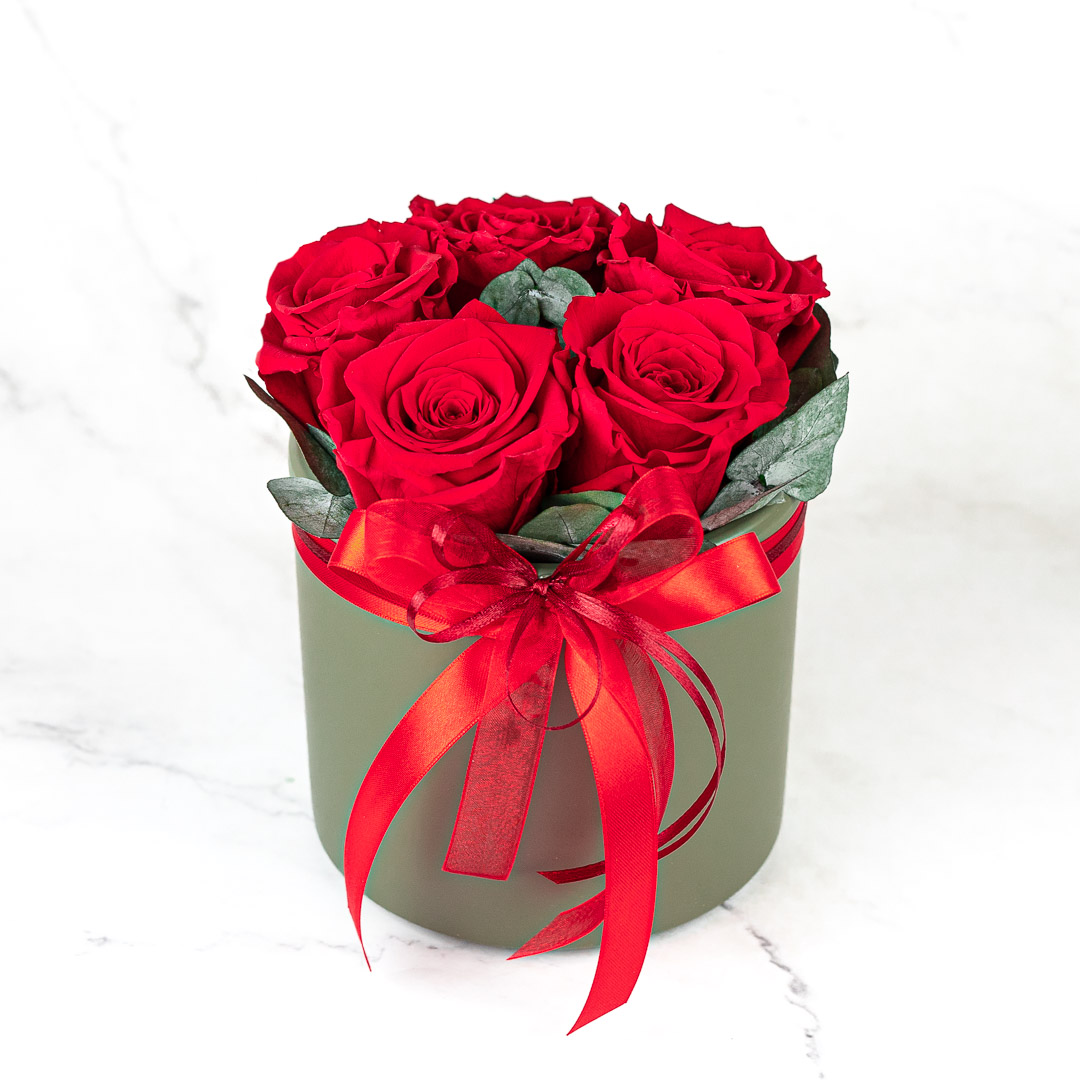 Kaunis seade koosneb suureõielistest punastest uinuvatest roosidest ja stabiliseeritud eukalüptist, mis on seatud keraamilisse ümbrisesse. Uinuvad roosid on ehtsad roosid, mis säilivad vähemalt 1 aasta.